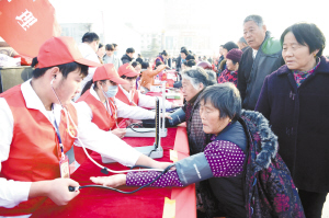 12月5日,志愿者在安徽亳州市魏武广场为市民义务测量血压。