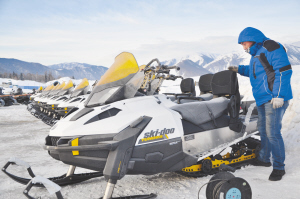 12月2日,技师在检查喀纳斯景区为游客准备的雪地摩托车。