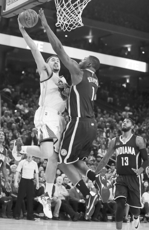 当日,勇士队球员汤普森(左)在比赛中上篮。