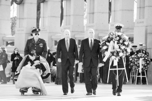 12月7日,在美国首都华盛顿的二战纪念广场,美国当选副总统迈克·彭斯(右二)、国会参议员约翰·麦凯恩(右三)和珍珠港事件幸存老兵(坐轮椅者)参加纪念仪式。