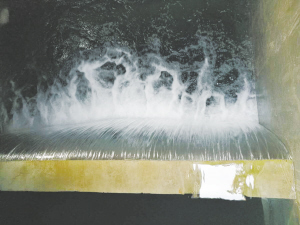 在商水水厂总经理何炳旭的指引下,周口晚报记者看到丹江水伴着“哗哗”的响声注入水厂反应池(图四)。何炳旭介绍,商水水厂总设计规模每天供水3万立方米。