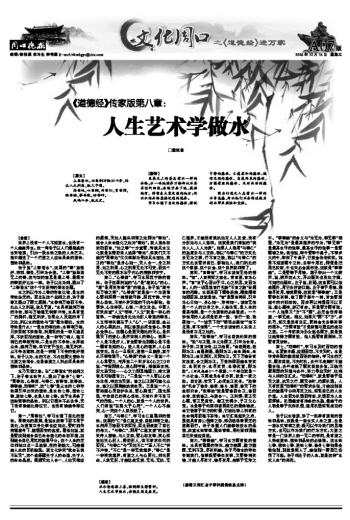 世界上没有一个人不知道水,也没有一个人能离开水。这一章老子以人们最熟悉的水来喻道,引出一段水性之美的人生艺术,集中阐述了一个行道之人应当具备的道性、德性和品性。