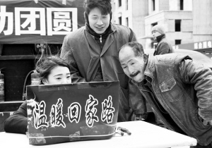 12月13日,大学生志愿者在为农民工登记购票个人信息。