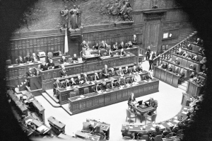 12月13日,意大利总理真蒂洛尼(后中)在位于罗马的众议院发表讲话。