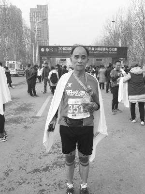 来自山东聊城的65岁老人杨树山轻松完成了半程马拉松比赛, 1小时40多分钟的成绩他觉得有点儿差,但这个成绩却让很多参赛选手赞不绝口。