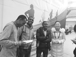 在全程马拉松比赛中,60名外籍选手格外引人注目,也是夺冠大热门。赛前周口晚报记者偶遇3名外国青年,通过志愿者的翻译交流后得知,他们来自埃塞俄比亚,一名叫Bekele,一名叫Tsega,另外一名是他们的经纪人,两位选手均是专业马拉松选手,此次在经纪人的陪同下专程来到周口参加比赛。
