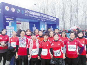 为支持周口马拉松比赛,展示企业形象,周口本地最大酒企河南祥龙四五酒业向组委会赞助一批伏羲贡系列酒,并组织50名员工参与马拉松比赛,酒业高端产品伏羲贡系列酒被指定为周口马拉松唯一指定用酒。图为该企业参赛队员在现场留影。