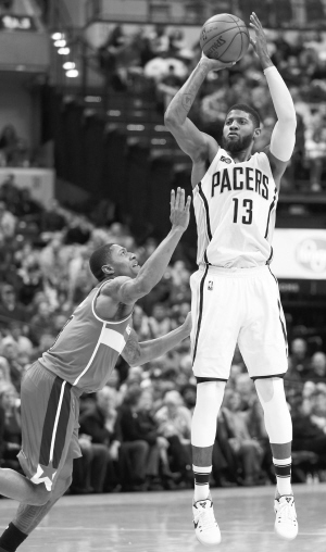 当日,步行者队球员保罗·乔治(右)在比赛中投篮。
