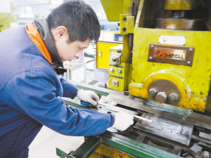 作为一名熟练工,接到生产任务后,刘矿利需要先拿起卷尺,用十几分钟的时间在机器上调好刻度,然后将材料放置在机器上打孔。而新手往往需要大约半小时,才能将刻度调整好。第一步完成后,机器开始运转。尽管之前已经费时费力将刻度调整好,但在冲孔机与材料冲撞的过程中,难免会有位移,需要刘矿利每隔十几分钟,就拿着卷尺重新测量一遍,以确保成品的精确。