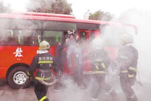 12月21日,四川省华蓥市的消防队员和汽车客运人员在进行乘客疏散应急演练。