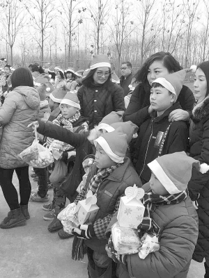 12月25日上午,百余名爱心人士来到商水县正生爱心学校,为这里的孤儿送去圣诞帽、苹果、糖果等礼物,同时还给学校送来了米、面、油等生活用品。