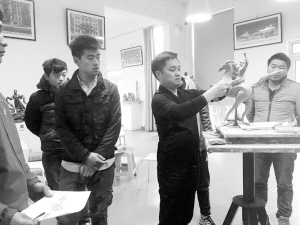 在设计基地1楼,工作人员正在制作雕塑模型,朱传经站在一旁耐心指导。“可别小看我们这里的工作人员,他们大都毕业于中央美术学院。制作雕塑模型是雕塑设计制作流程中的初步环节,也是一个小而精的关键环节……”朱传经这样介绍。之后,朱传经又如数家珍般给记者一行介绍了展架上雕塑模型的设计理念和实际实施情况。不知不觉间,天色已晚,于是,朱传经邀请记者一行到2楼办公室座谈。