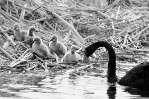 12月26日,一只黑天鹅带着5只小黑天鹅在湖边玩耍。
