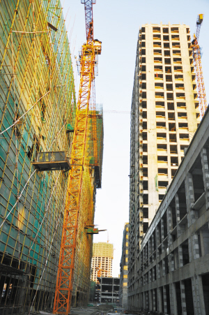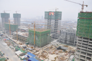 工地的东半部分是7栋不同高度的建筑,大部分已封顶,有的主楼建有配楼,4号楼最高,设计29层99米高。这7栋楼功能设计有LOFT、公寓、办公,下面3层纯商业功能,用连廊连接起来,实现四通八达的效果,客人从任何一个地方进入商业经营区,即可把这个东西200多米、南北100米的商业体看个全面。东西两部分建筑的中间是项目广场,位与大庆路正对面,广场的南部建有一栋小高层,酒店功能,目前主体已经竣工,正在进行内外粉刷。