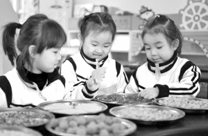1月4日,邢台市桥东区第二幼儿园的小朋友在辨识制作腊八粥的食材。