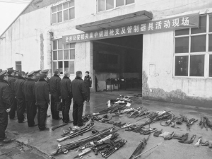 本报讯 1月6日上午,我市公安机关在黄泛区农场集中销毁枪支及管制刀具(如图)。此次集中销毁行动在很大程度上震慑了不法分子,同时也教育了群众。