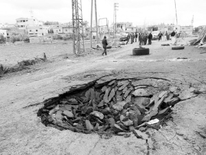 1月8日,在叙利亚首都大马士革西郊,汽车炸弹袭击后的地面露出大坑。