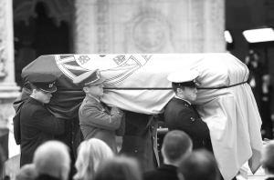 1月10日,在葡萄牙首都里斯本的热罗尼姆斯大教堂,士兵抬着葡前总统苏亚雷斯的灵柩。
