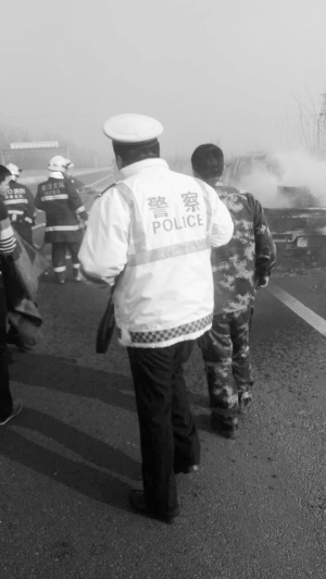 当日9时55分,有人报警称:在商周高速上有车辆发生自燃,具体位置不详。市交警支队商周高速大队民警迅速出警,在商周高速162公里+500米处发现起火车辆。司机告诉民警,他的车是油改气车辆,刚刚加满一罐天然气,因为起火突然,不知道该如何处置。民警立即采取措施,在起火点前后各3公里处设置管制点,对高速公路进行紧急管制,禁止一切车辆靠近危险区域。同时,民警向市交警支队指挥中心汇报现场情况,建议在起火车辆来车方向新周高速实施交通管制,分流车辆,减轻商周高速主线管制压力。完成各项管制措施后,高速事故大队民警和消防官兵及时赶到,很快控制火情,消除了随时可能爆炸的安全隐患,确保了他人生命和财产的安全(如图)。10时29分,道路恢复正常通行。