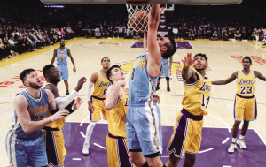 当日,在2016~2017赛季NBA常规赛中,丹佛掘金队客场以127比121战胜洛杉矶湖人队。新华社发