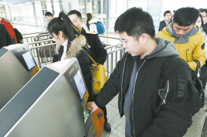 1月18日,返乡的旅客在南昌西站自动验证检票机前“刷脸”进站。