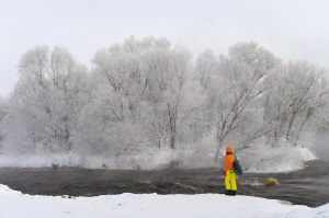 1月21日,一名游客在欣赏库尔滨河畔的雾凇。库尔滨是鄂伦春语“渔场”的意思。库尔滨河发源于小兴安岭北麓,自南向北流经黑龙江省逊克县。由于库尔滨河上游建有水电站,河水经过水轮机组后温度升高,再遇到严寒天气,便形成河水几十里不冻,而岸上雾凇成片的美景。
