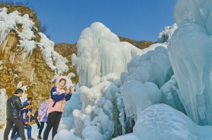 2月1日,游客在河北省唐县全胜峡景区内游玩。