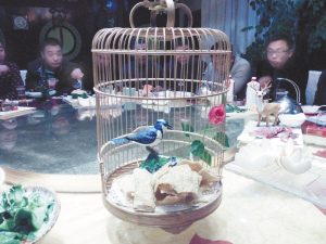 春节期间,我市一田园主题餐厅推出以竹木藤草等为材料的创意餐具,这些餐具纯手工制作,保持材料原始自然质朴,又融合现代声光电科技,使顾客在酒店不仅吃出好的味道,还可以享受原生态产品服务,回归自然。图为以鸟笼餐具创意的菜品“凤还巢”,食客可在悦耳的鸟叫声中体验美食带来的诱惑。记者 付永奇 摄