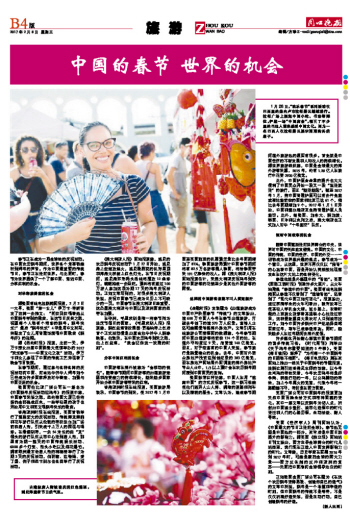 香港亚洲时报在线报道,英国旅游局表示,中国春节的到来,使2017年1月中国至英国航班的机票预定量比去年同期增加了81%。泰国旅游局预计中国春节期间将有82.5万名游客涌入泰国,将给泰国带来191亿泰铢的收入。据《澳大利亚人报》网站报道估计,来澳大利亚庆祝鸡年到来的中国游客的花销至少是其他外国游客的两倍。