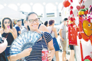 1月28日,“欢乐春节”系列活动在巴西里约热内卢市拉帕景区继续进行。拉帕广场上摆起中国小吃、书法等摊位,俨然一场“中国庙会”,吸引了不少里约当地人前来感受中国文化。图为一名巴西人在拉帕景区展示刚刚购买的扇子。