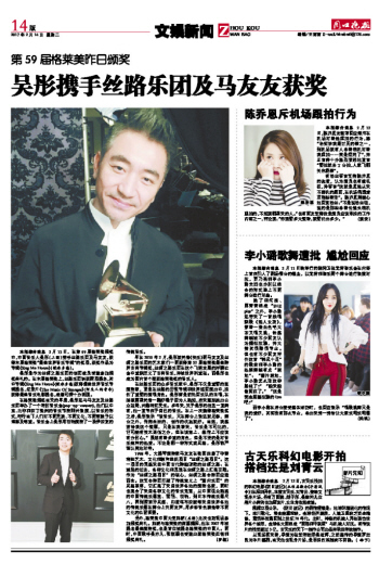 本报综合消息 2月13日,在第59届格莱美颁奖中,中国音乐人吴彤(上图)携手丝路乐团及马友友,获得本届格莱美“最佳世界音乐专辑”的奖项,获奖作品为专辑《Sing Me Home》(歌咏乡愁)。