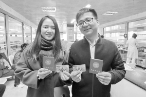 2月14日,在浙江省嘉兴市中心血站,一对情侣献血后合影。