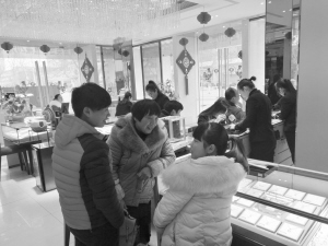 当日10时许,周口晚报记者在中心城区部分黄金珠宝店看到,不少市民正在选购黄金珠宝饰品,有年轻的情侣和夫妻,还有上了岁数的老夫妻。“今年是妻子的本命年,我打算送她一个金鸡吊坠。”市民王先生告诉周口晚报记者,以前他和妻子过情人节,都选择鲜花和巧克力作为礼物,随着年龄的增长,他感觉鲜花和巧克力不仅不能长期保存,还无法见证他们的爱情。于是,黄金珠宝饰品成为他新的选择。