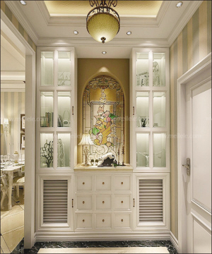 杂物柜可以采用吊柜加地柜的组合,上方的吊柜可以用来放置一些常用的物品,如婴儿用品、妈咪包、包包;还可以内置掉挂钩,用来吊挂钥匙、少量首饰等。下方的柜子可以用来收纳雨伞、折叠式的买菜车、婴儿车等。还可以设计嵌入式的玄关椅,方便放拖鞋。吊柜与地柜之间则是操作台,这里方便放置进门随手可放的快递、食物等。还可以有一个钥匙盘,这样进出门就能随手拿放钥匙。