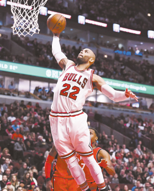 当地时间2月14日,公牛队球员吉布森在比赛中扣篮。当日,在2016~2017赛季NBA常规赛中,多伦多猛龙队客场以94∶105不敌芝加哥公牛队。新华社发