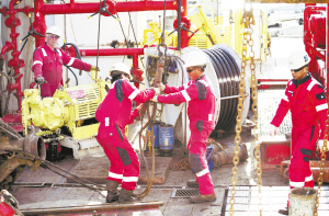2月14日,“决心”号上的钻探工人在进行钻探前的准备工作。