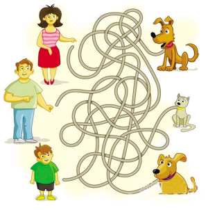 出门遛狗当然要牵着狗绳了,但是狗绳缠在一起可就麻烦了。小朋友们顺着主人手里的狗绳来找一找,看看每只狗狗的主人是谁吧!