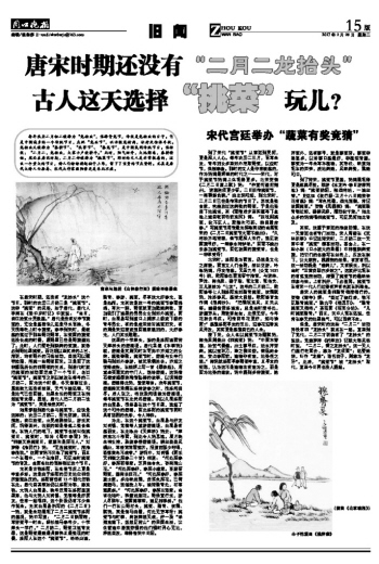 在唐宋时期,还没有“龙抬头”这个节日,那时的农历二月初二是“挑菜节”。这种“挑菜”的风俗,始于唐代,唐代人李淖在《秦中岁时记》中就说:“当日,曲江拾菜士民极盛。”唐代是没有反季节蔬菜的,无论是皇帝老儿还是平头百姓,冬天很难吃上时令蔬菜。春季到来时,最敏感的莫过于那些野花野草,在菜园的蔬菜还没长成的时候,原野里已经是野蔬遍地了。此时,人们要吃到新鲜的菜蔬,就势必到野地里挑菜。而花朝以至其后的上巳、清明,均有野外的习俗活动,自然可以顺带拾掇、挖挑一些野菜回来。正是因了这种源远流长的和野菜的关系,到唐代时就把挑菜的活动固定成了一个节日,名曰“挑菜节”。挑菜节之所以被放在每年的二月初二,因为这个时候,冬天刚刚过去,虽然数九还没有结束,天气乍暖还寒,可是地气已经回暖,地里生长的野菜正在悄然返青发绿。显然,唐代人把二月初二设为“挑菜节”,真是恰逢其时。