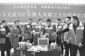 本报讯 当年在广东九江大桥边拦车救人的太康人王文田近日突发脑溢血,住进了广东省佛山市顺德区广州中医药大学顺德和平外科医院。得知他患病的消息后,太康县文明办和太康县志愿者协会发出倡议,号召大家给王文田捐款,助他渡过难关。2月27日上午,太康县文明办和太康县志愿者协会在该县人民广场举行捐款仪式,大家争相捐款。