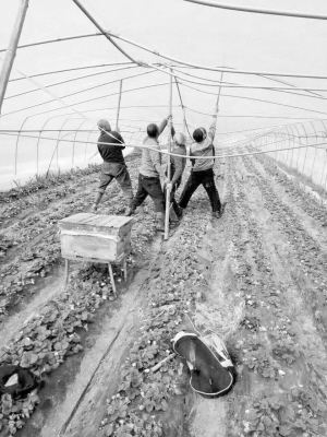 今年33岁的翟永生,怀揣着质朴的致富梦想,在206省道旁的商水县姚集乡断堤村承包了100多亩地,建起鑫丰家园农场种植草莓和西瓜。前些日子,一场突如其来的大雪从天而降。虽然翟永生组织工人清除大棚塑料薄膜上的积雪,但效果并不好。最终,80多个大棚承受不了压力,被压毁。