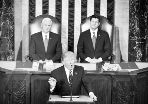 2月28日,美国总统特朗普(前)在华盛顿国会山发表演讲,副总统彭斯(后排左)和众议院议长保罗·瑞安(后排右)出席。