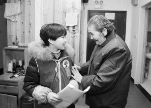 3月2日,在上海黄浦区申福敬老院,老人与小志愿者交流。