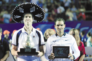 当地时间3月4日,奎里(左)与纳达尔在颁奖仪式上合影。当日,在墨西哥阿卡普尔科举行的ATP墨西哥网球公开赛单打决赛中,美国选手奎里以2∶0战胜西班牙选手纳达尔,夺得冠军。新华社发