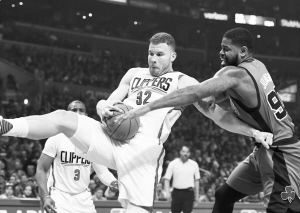 3月6日,在2016-2017赛季NBA常规赛中,洛杉矶快船队主场以116:102战胜波士顿凯尔特人队。 当日,快船队球员格里芬(前左)与凯尔特人队球员约翰逊在比赛中争抢篮板球。