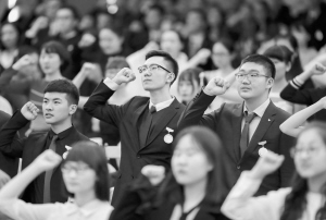 3月7日,北京四中呼和浩特分校的学生在成人礼上宣誓。