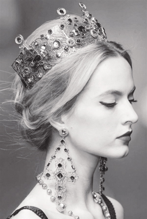 相信每个女孩心里都有一个公主梦:在森林古堡中穿着白纱华服,静候王子为自己戴上冠冕。纵观Dolce&Gabbana近几年的秀场,极致奢华的皇冠头饰充满了拜占庭风格,珠宝、雕花和贵金属的混搭完美诠释了巴洛克的繁华,工艺精湛的宝石镶嵌演绎出西西里王妃的性感与美艳。不妨将头发中分后盘起,两侧稍微外翻令发型蓬松中略显自然,搭配华丽长裙辅以优雅的妆容,再戴上精心挑选的冠冕发饰挑战他的视觉神经。(李铮)