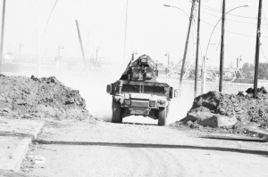 3月7日,伊拉克警察部队汽车在摩苏尔市中心执行军事行动时行进。