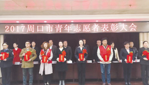 本报讯 3月9日上午,2017周口市青年志愿者表彰大会召开(如图),焦阳光等10位同志荣获“周口市金牌青年志愿者”称号;杨灿等150位同志荣获“周口市青年志愿者优秀个人奖”;周口师范学院青年志愿者协会等65个单位被授予“周口市青年志愿者优秀组织奖”。