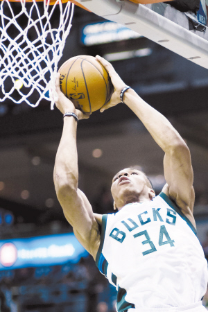 当地时间3月8日,雄鹿队球员安特托昆博在比赛中上篮。当日,在2016~2017赛季NBA常规赛中,密尔沃基雄鹿队主场以104∶93战胜纽约尼克斯队。新华社发