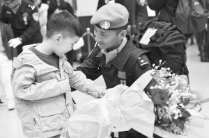 3月12日,在杭州萧山国际机场,中国第四支赴利比里亚维和警察防暴队队员刘道满(右)抵达后向儿子介绍胸前的勋章。